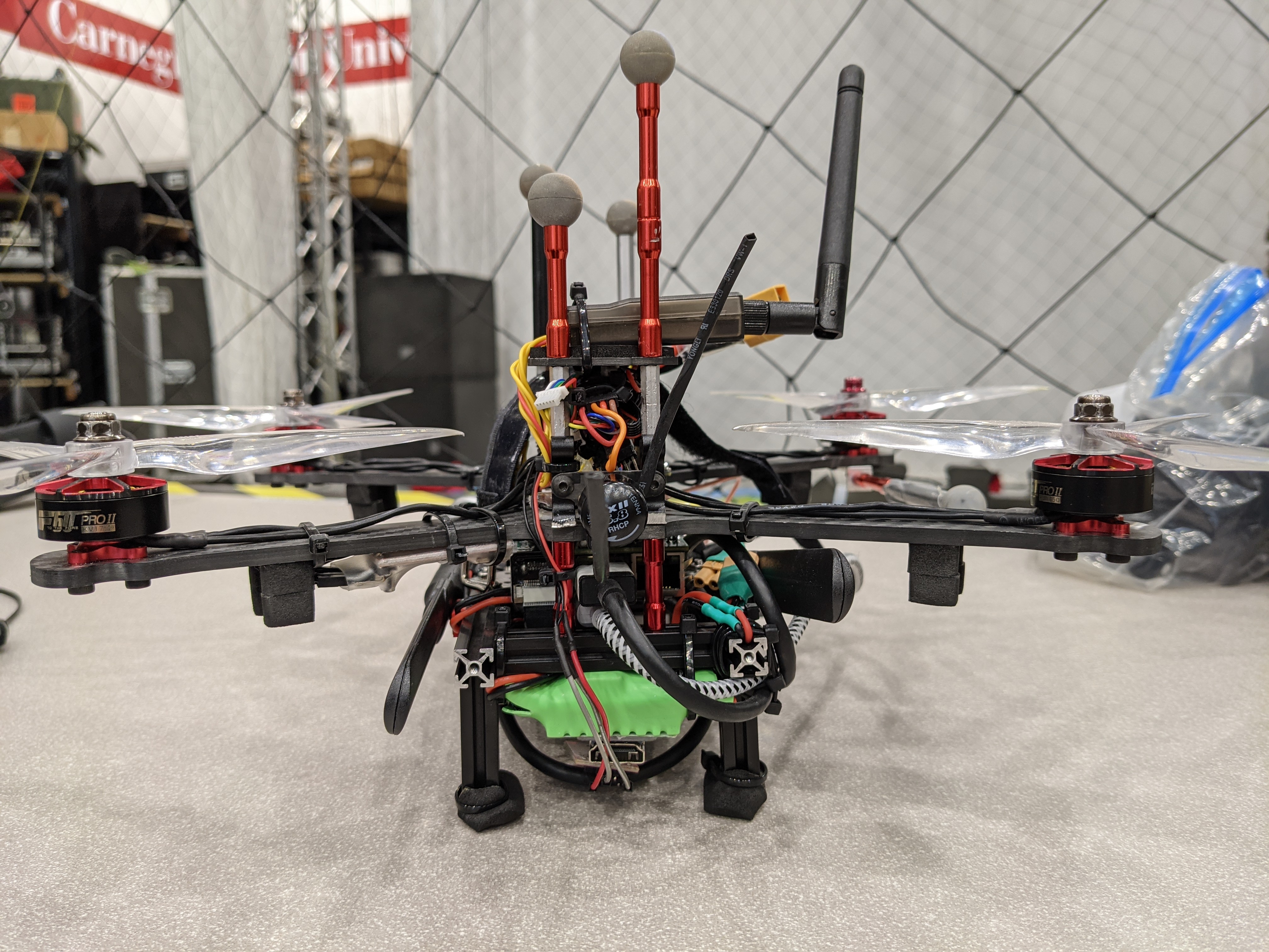 The flight controller is an mRo Pixracer connected to a 4-in-1 Lumenier BLHeli32. Power to the vehicle is supplied via a Holybro Micro Power Module. A 4S 1500mAh battery is used to supply power to both the onboard computer and the flight electronics.
